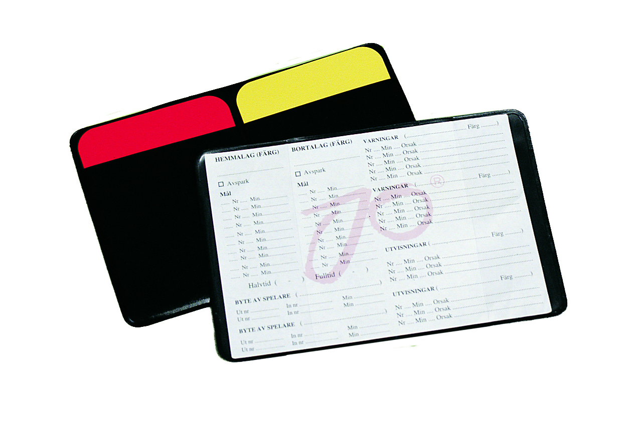 Foldbar mappe i Pocket-model, indeholdende røde kort, gule kort og scorecard.