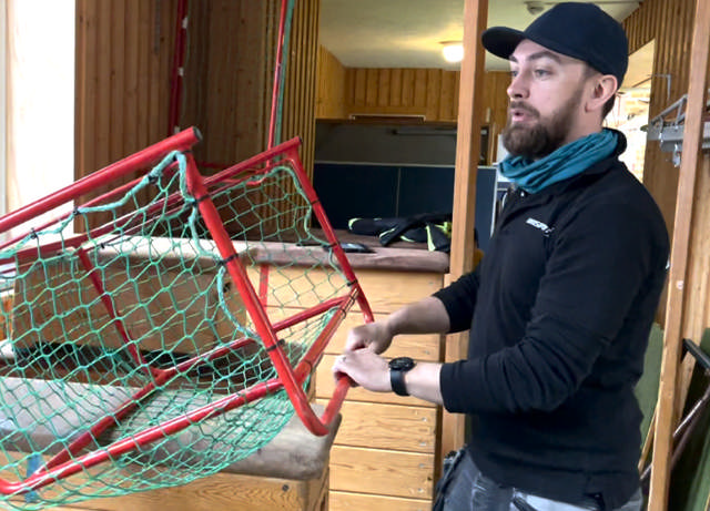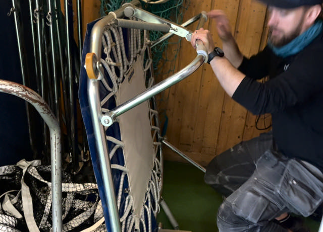 Tarkastetaan, että verkko ja kiristysnarut ovat kunnolla kiinni. Tarkastetaan tolpat, että ne ovat sileät eikä niissä ole halkeamia.