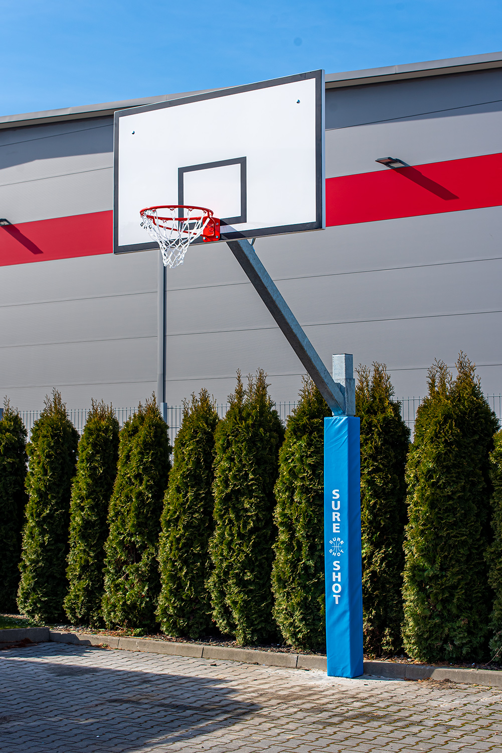 Korilevy laminoitu 180 x 105 cm. Tukeva kuumasinkitty teräspylväs 120 x 120 mm. Levyn ulkonema 165 cm. Sisältää korirenkaan, verkon ja maaholkin. Korkeus 305 cm. Kovan tolppapehmuste ostettava erikseen.