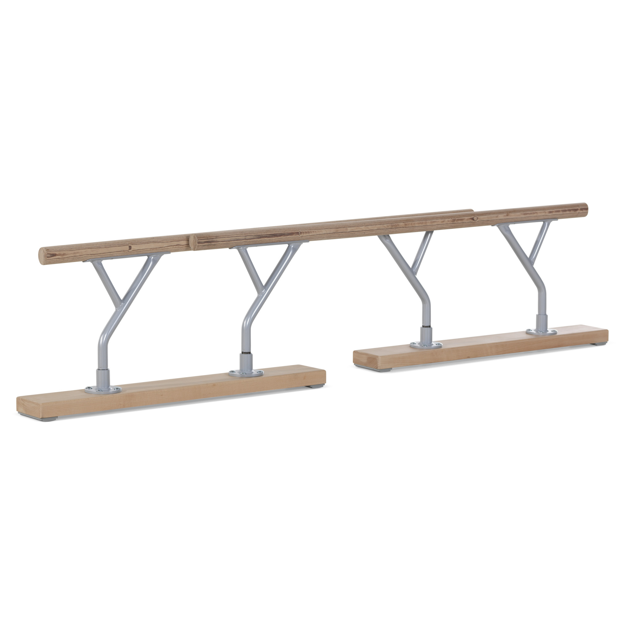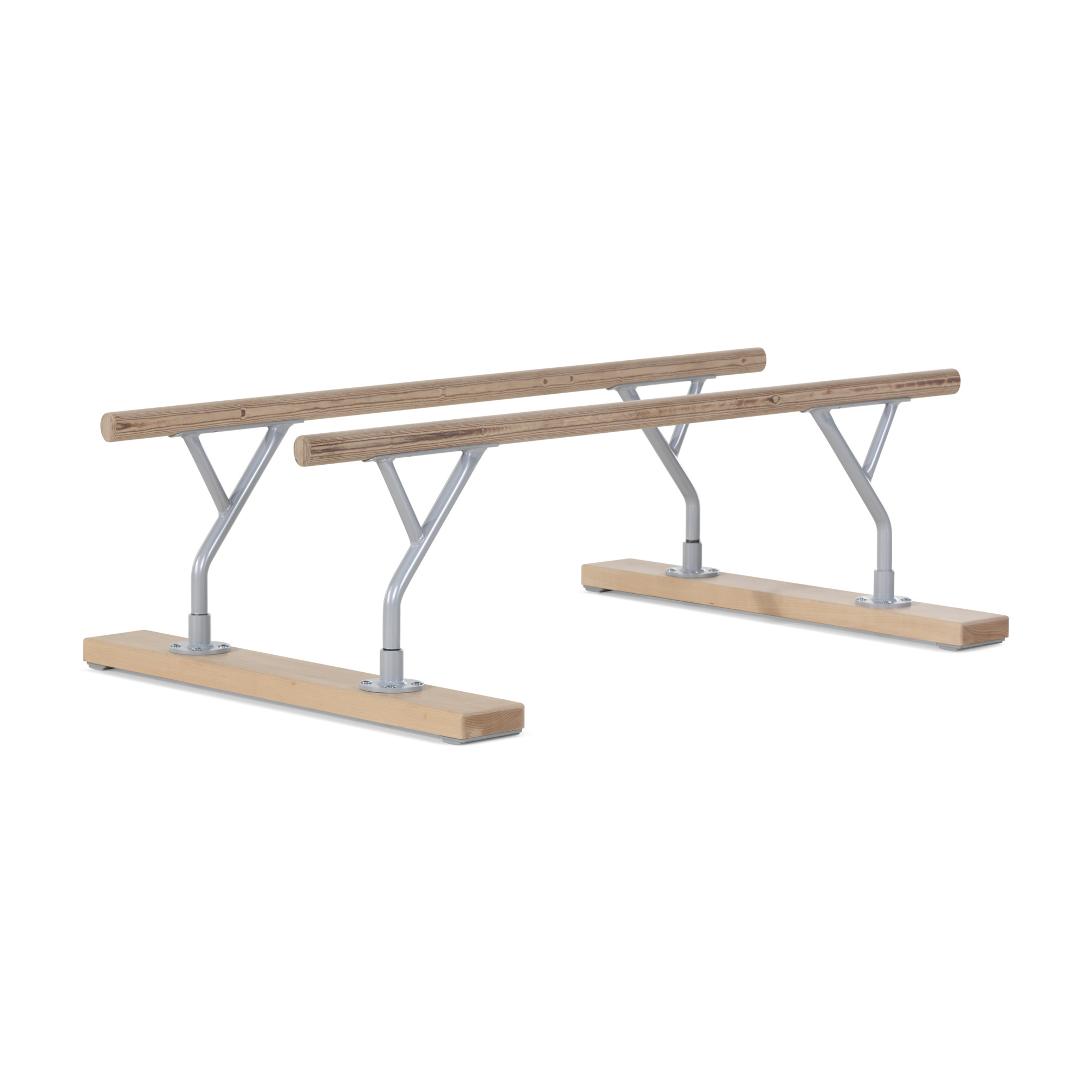 Kokoontaitettavat harjoitusnojapuut portaattomalla leveydensäädöllä. Pinnoitettujen puuaisojen maks. etäisyys 46 cm. Korkeus 40 cm, aisojen pituus 250 cm.