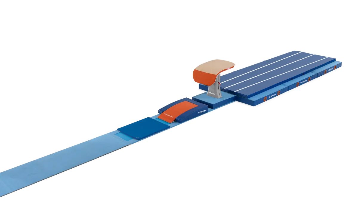 Koostuu neulahuopapintaisesta vauhdinottomatosta, liukumattomasta ponnistuslaudan aluslevystä sekä hyppytelineen tuesta, jossa on läpivienti hyppytelineen kiristysketjulle. Kolme osaa on yhdistetty toisiinsa tukevasti tarranauhalla. Toimitukseen kuuluu rullattava ydin ja mittanauha. Ainutlaatuinen ponnahduslauta. Kokonaispituus 25 m. Juoksumaton leveys 100 cm, paksuus 25 mm, pituus 23,1 m. Ponnistuslaudan levyn pituus 244 cm, hyppytelineen levy 199 cm.