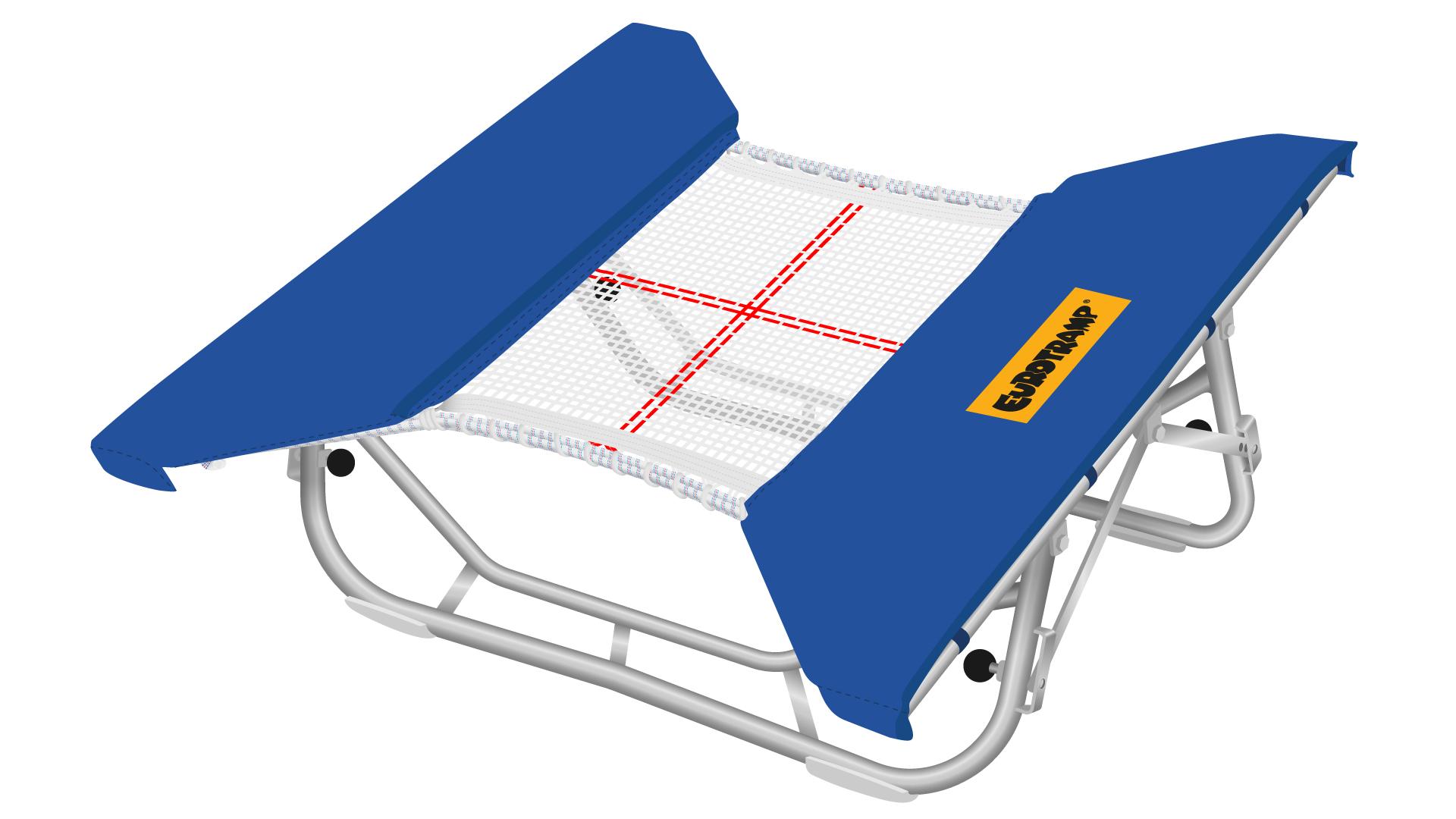 Etu- ja takaosastaan avoin minitrampoliini. Soveltuu erinomaisesti harjoituskäyttöön ja esim. voimistelutelineiden apuvälineeksi. Rungon koko 120x120 cm, korkeus 35,5-37,5 cm. Säädettävä hyppykulma. 60x70 cm nylonverkko, lankavahvuus 6 mm. 32 kpl 185x32 mm teräsjousia. 24 mm paksut jousien suojapehmusteet. Kumiset lattiasuojat.