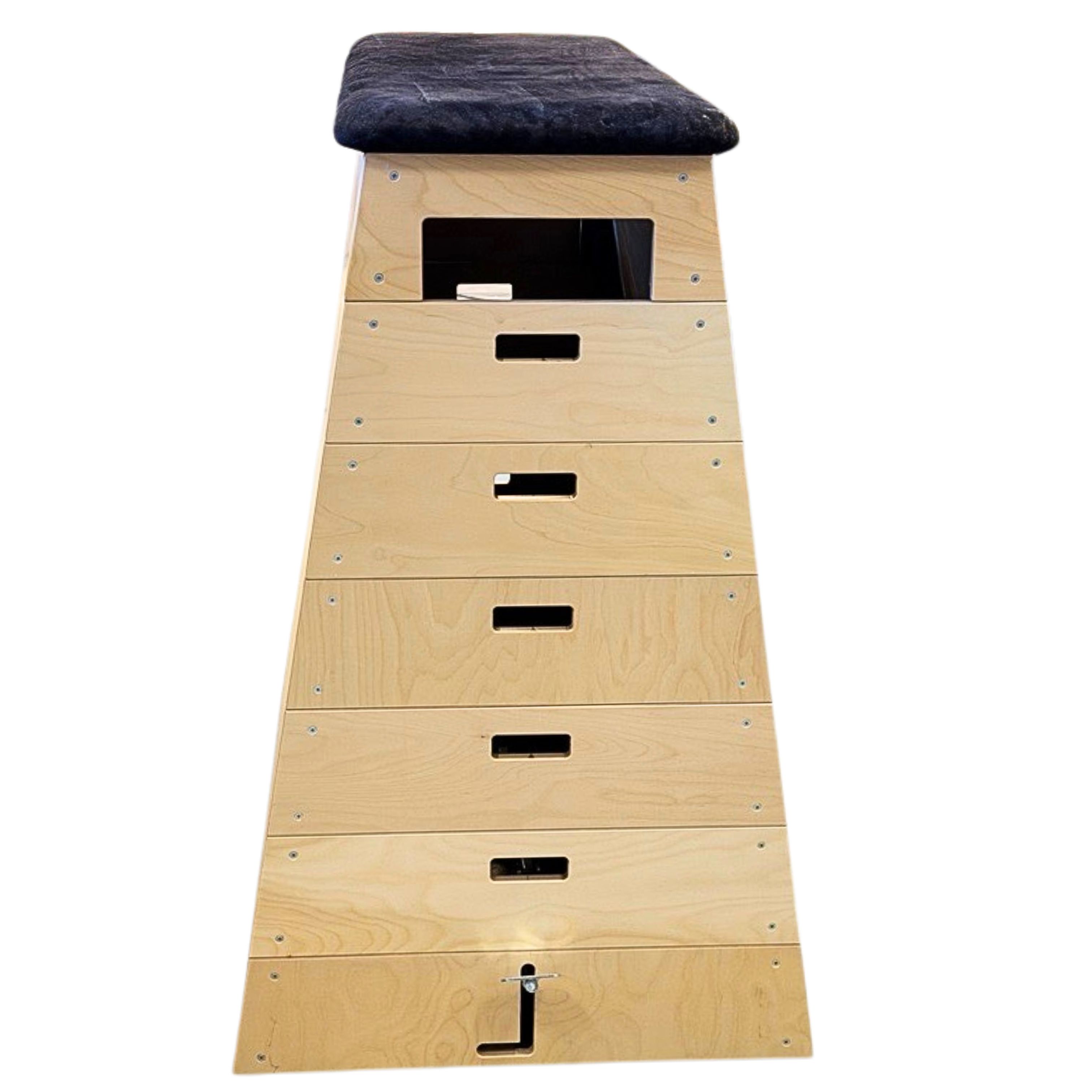 Koivuvaneria. Arkun kansi nahkaa. Pituus 1200 mm. Leveys 700/450 mm. Korkeus 1020 mm tai 1180 mm. Kuljetuspyörillä.
