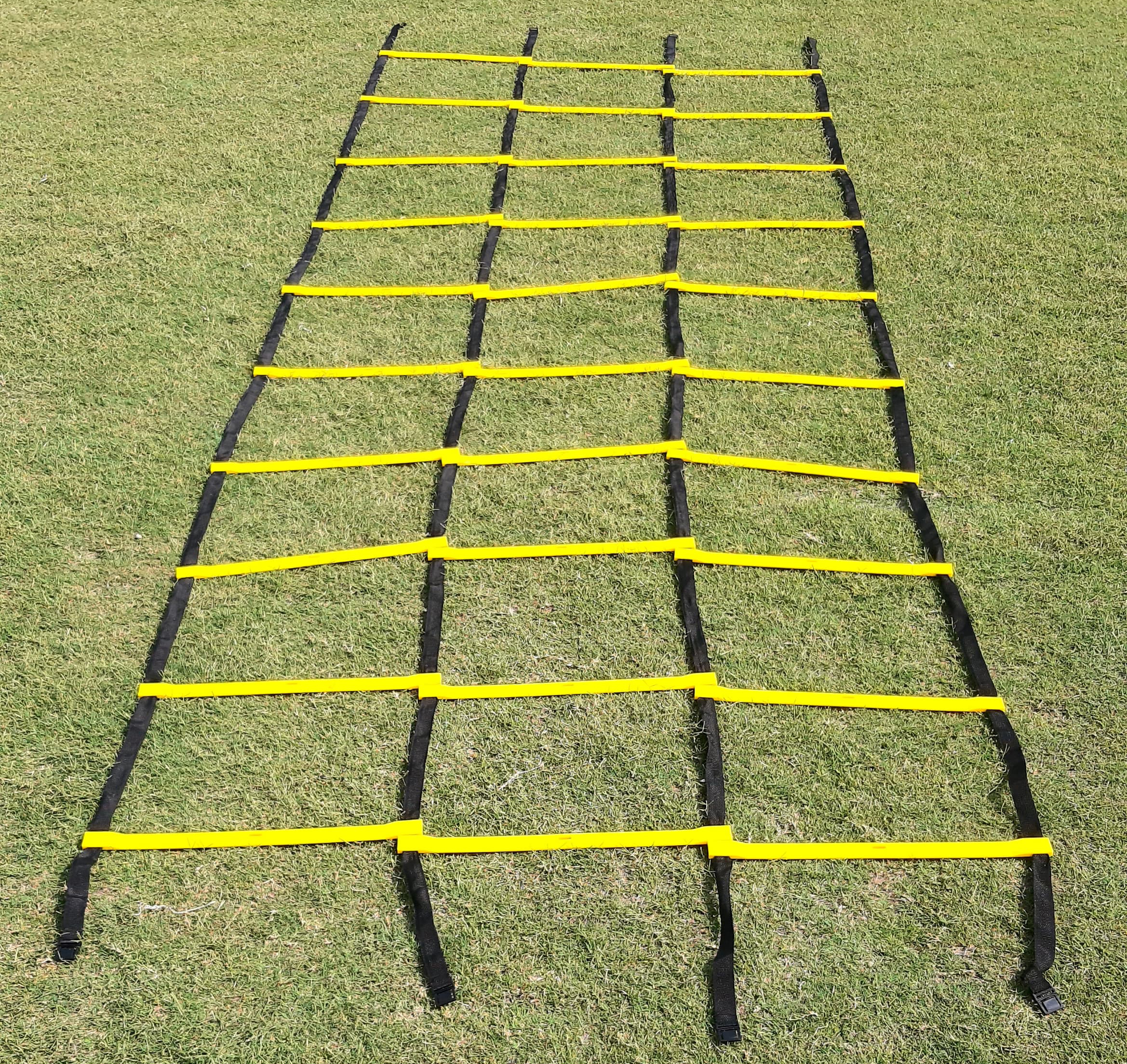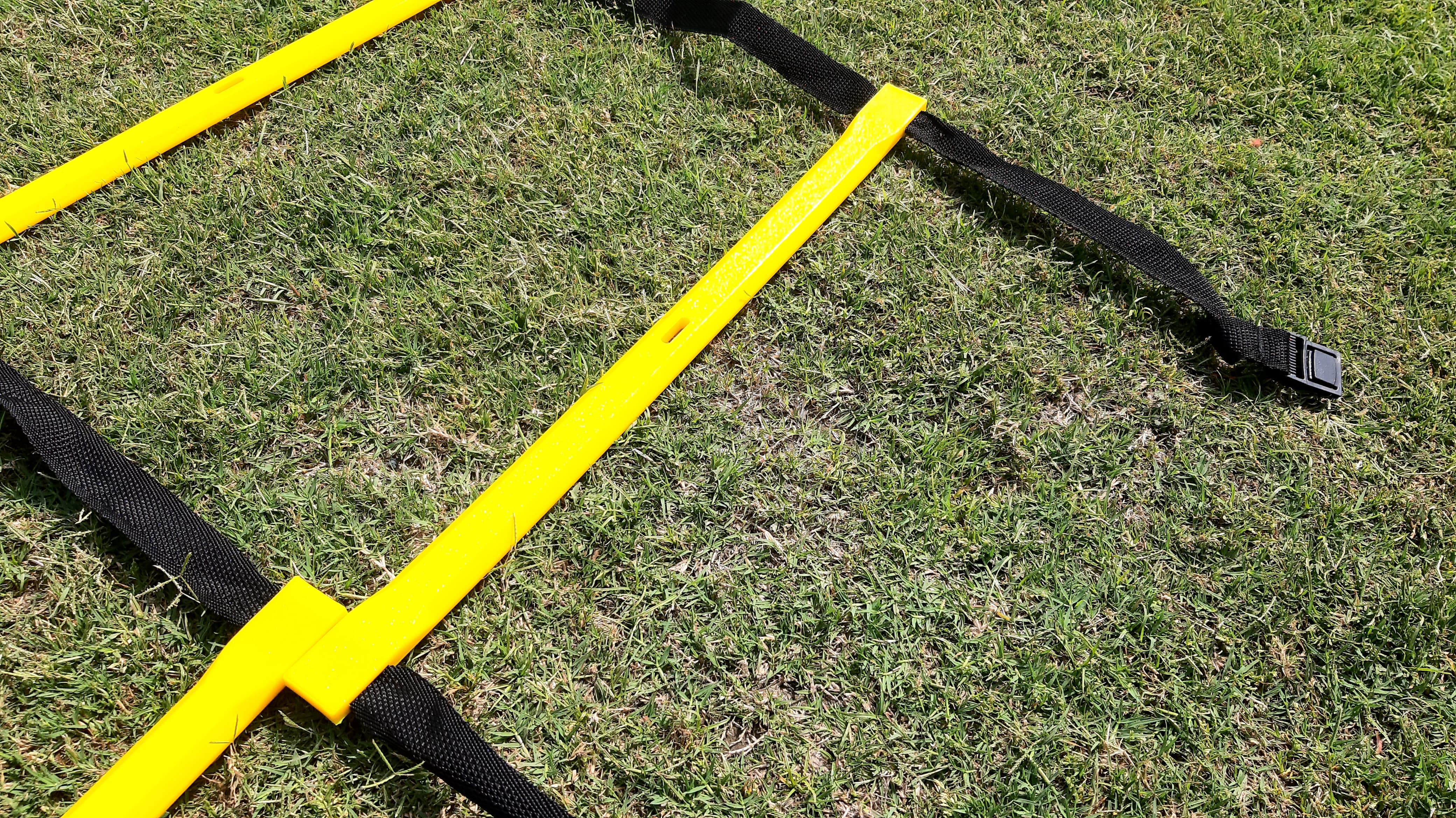 Väliputket kovamuovia, sivuilla nylonnauhat. Tikkaiden väli portaattomasti säädettävissä. Useampia tikkaita voi yhdistää keskenään. Sisältää säilytyskassin. Leveys 171 cm.
