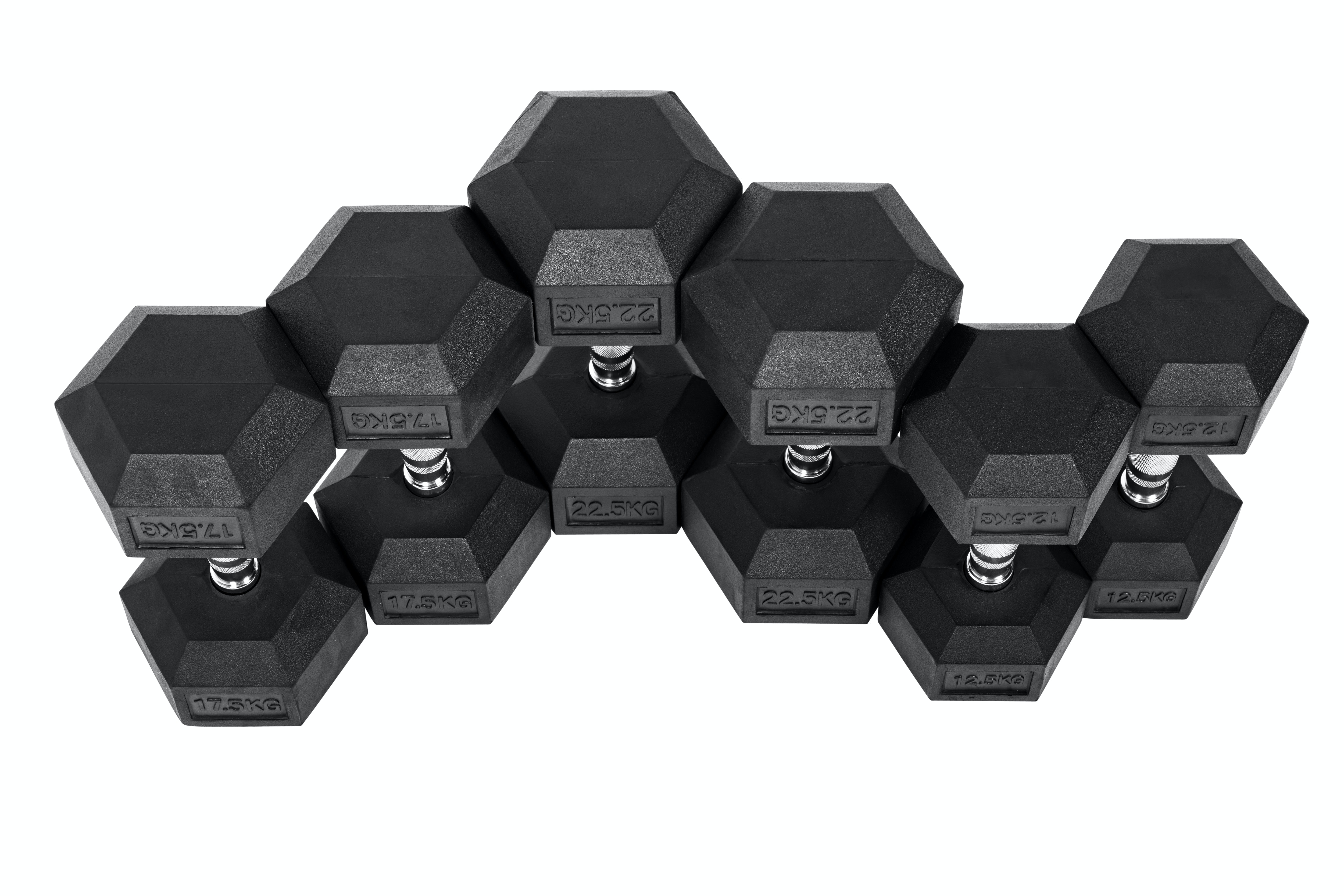 Laadukkaat käsipainot, jotka sopivat niin kaupalliseen käyttöön kuin kovaan voimailukäyttöönkin. Painojen kiinteän 6-sivuisen muotoilun ansioista ne eivät pääse pyörimään lattialla ja niitä voidaan hyödyntää esimerkiksi erilaissa punnerrusliikkeissä. Kumitettu paino-osa estää painojen pudottamisesta aiheutuvaa kolinaa ja suojaa lattiaa naarmuuntumiselta tehokkaasti. Jokaisessa painossa on samankokoinen, 34 mm paksu muotoiltu otekahva, jonka ansioista painot sopivat hyvin käteen kaikenlaisessa harjoittelussa.