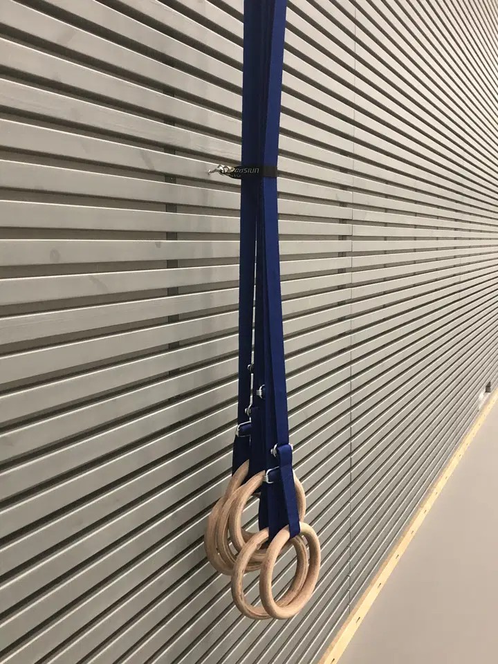 Kankaiset hihnat voimistelurenkaille. Sisältää soljen pituuden säätämistä varten sekä teräskolmion kattokiinnitykseen. Myydään pareittain. Voimistelurenkaat 120327 ja 120328 myydään erikseen.