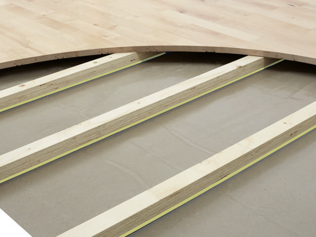 22 mm paksut massiivipuulattialaudat asennetaan joustavan aluslattiajärjestelmän päälle, joka koostuu yksikerroksisista, erikoisvalmisteisista rimoista. Koolaus asennetaan yhtenäisen, iskuja vaimentavan vaahtokerroksen päälle, mikä parantaa lattian joustavuutta ja lisää käyttömukavuutta.