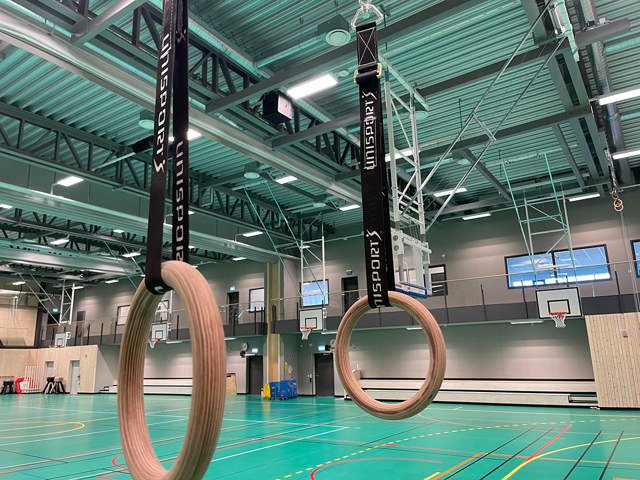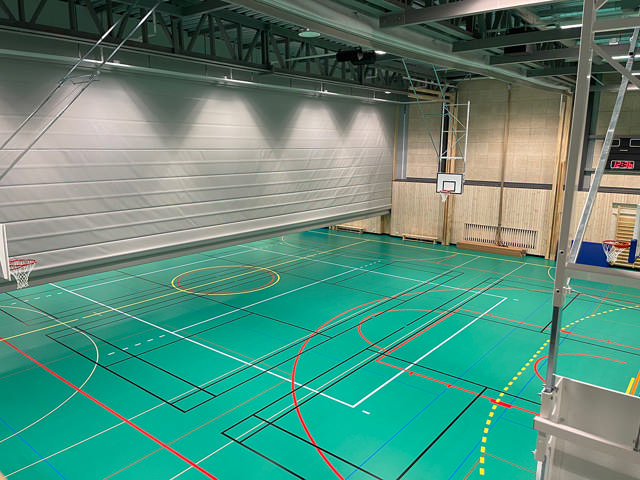 Unisport har installerat all fast utrustning i hallen såsom ridåvägg, bomsystem, ribbstolar, takhängda basketmål, matthissar, handbollsmål mm. Unisport har även levererat all sporthallsutrustning i hallen såsom mattor, tennisnät, innebandyutrustning (mål, hjälmar, bollar, klubbor), handbollsutrustning, basketutrustning mm. Vi har även installerat bänkar i omklädningsrummen.