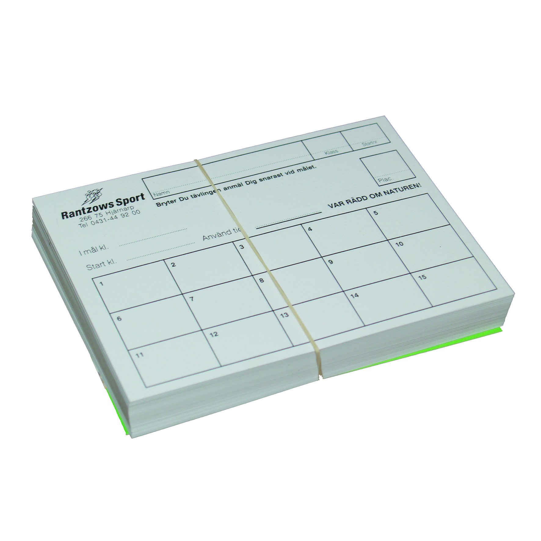 Startkort for orientering 15 ruter/kort. Kortene leveres i pakker med 100 stk i en og samme farge. Fargen på 100-pakken varierer.