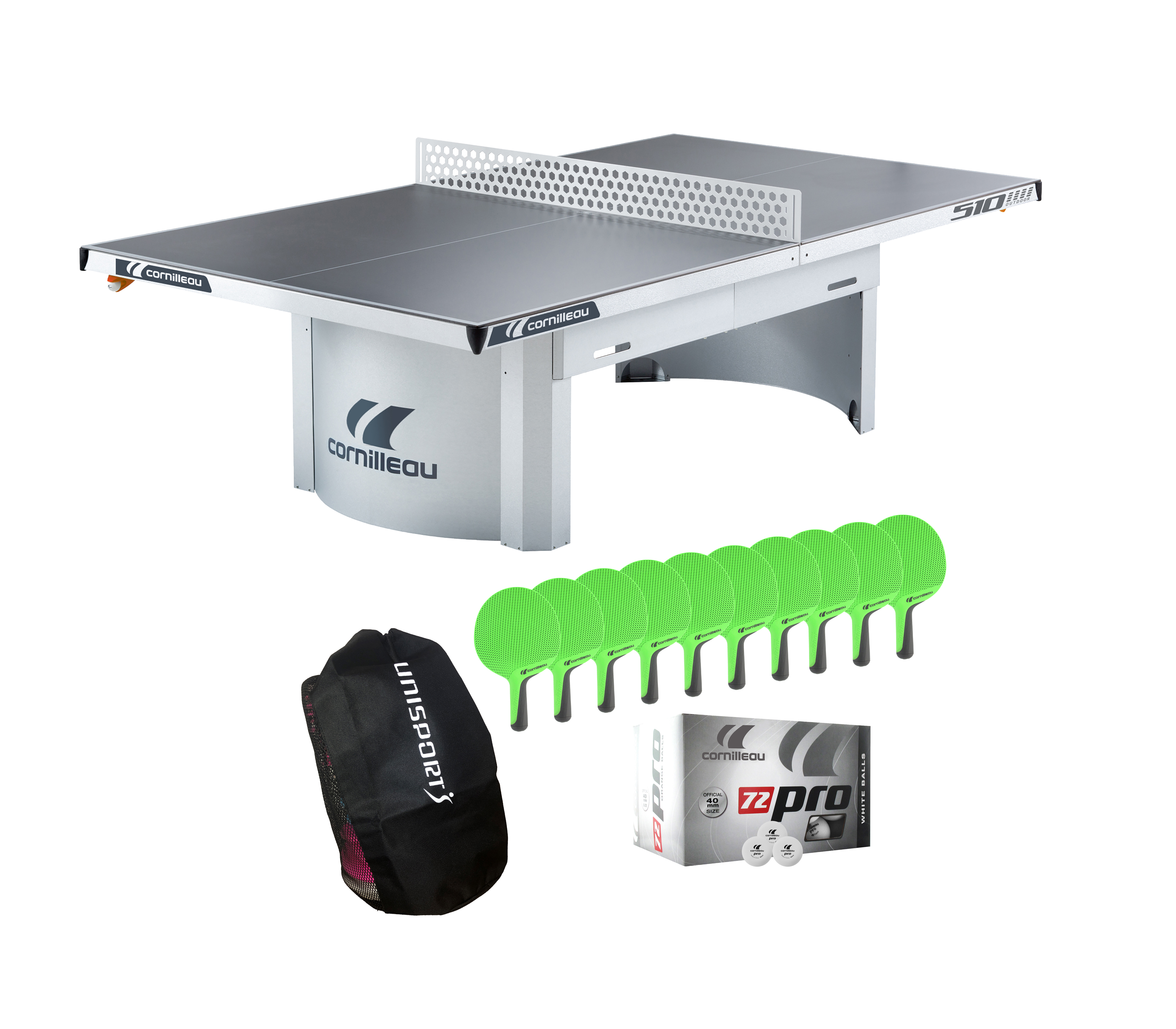 Komplett bordtennispakke for utendørs bruk bestående av et Cornilleau Pro 510 Outdoor modell bord (med galvanisert stålnett og kantbeskyttelse), 10 Cornilleau Eco-racketer, 72 baller og en oppbevaringspose. Bordet har 7 mm plate, lakkert stålramme og ben som kan forankres til bakken. De ulike delene kan også kjøpes separat.