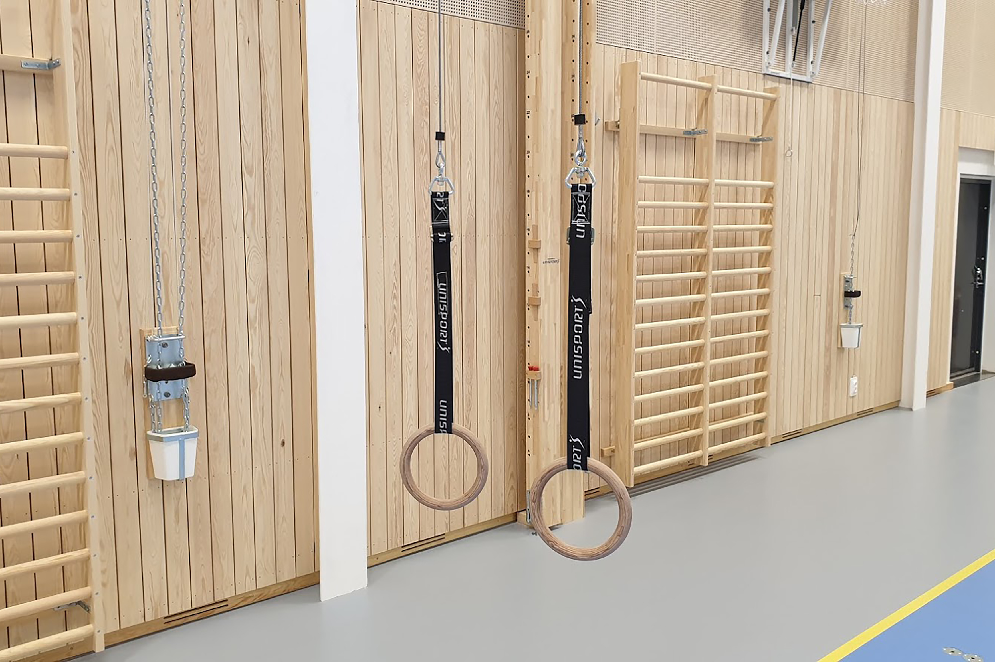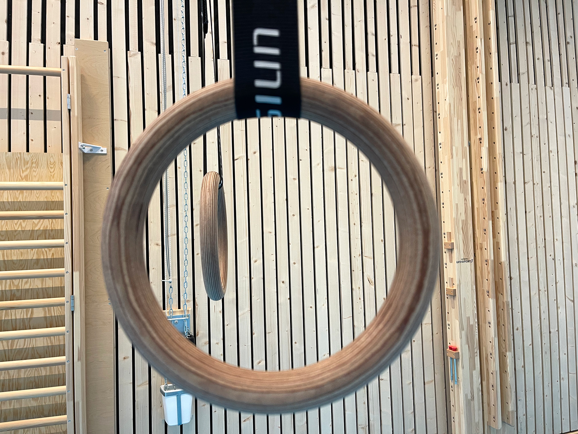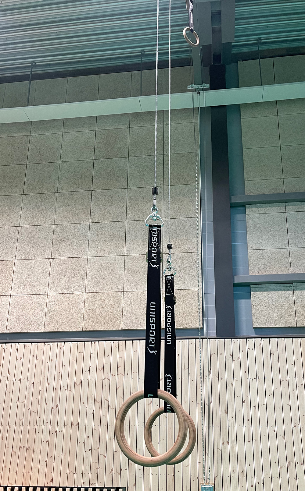 Ringer laget av bøk med individuelt justerbart bånd for hver ring. Kraftig låsbart kjedefeste med skinnkledd beskyttelsessløyfe. I hevet stilling oppbevares kjedet i en innebygd beholder som følger med. Med 1 par ringer. Maks takhøyde: 6000 mm alternativt 9000 mm.