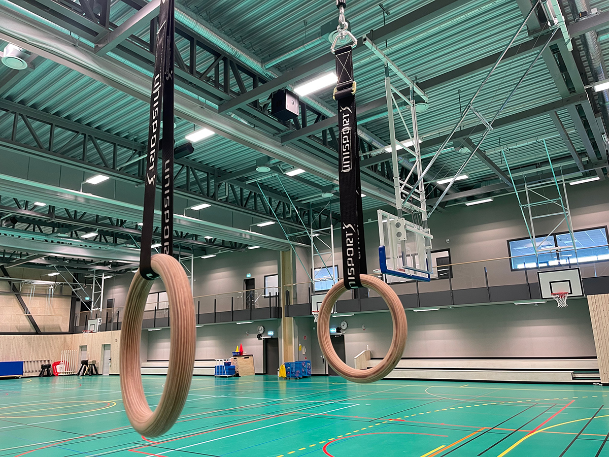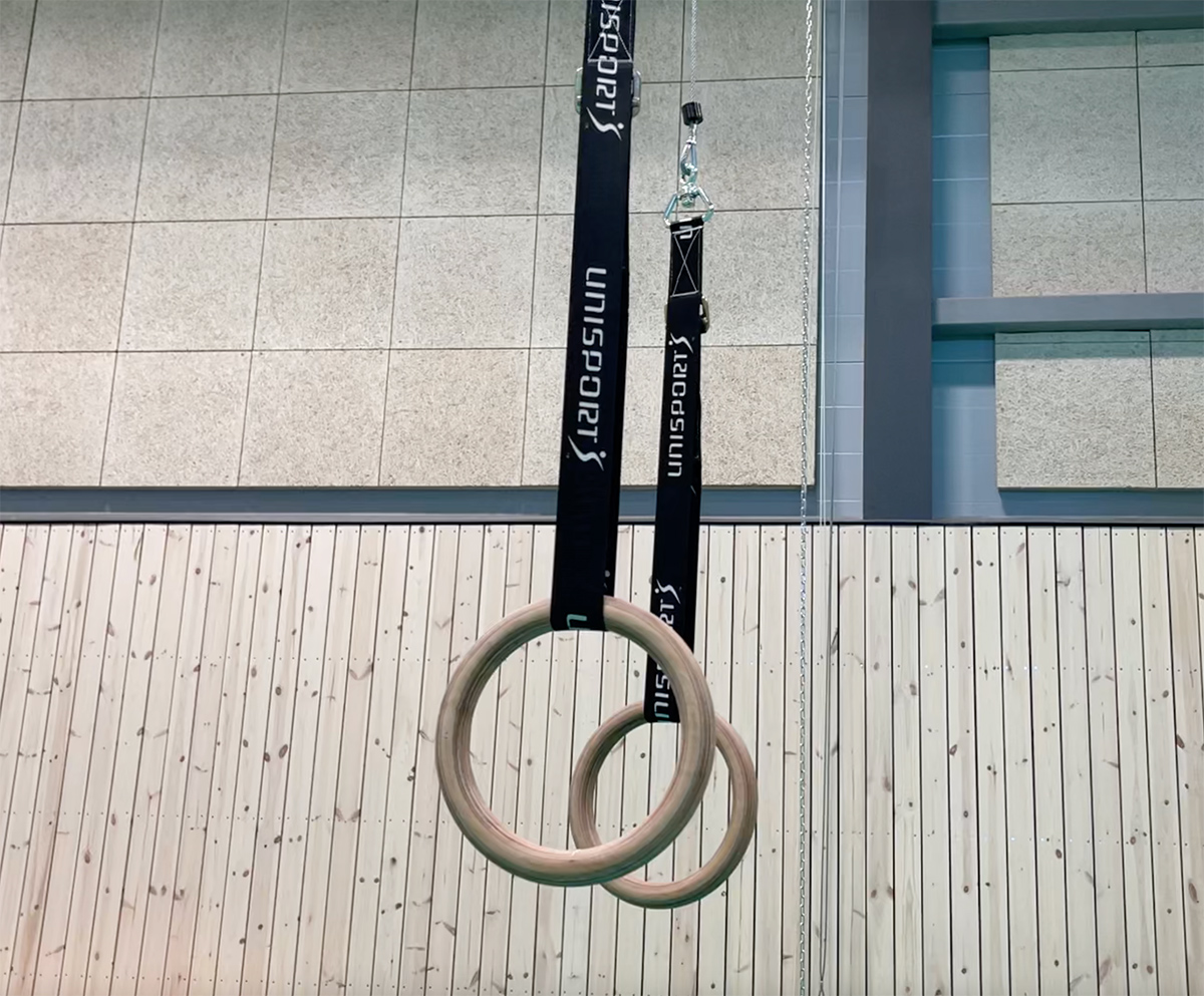 Ringar av bok med individuellt justerbart band för varje ring. Kraftigt låsbart kättingfäste med läderklädd skyddsbåge. I upphissat läge förvaras kättingen i en inbyggd behållare som ingår. Med 1 ringpar. Max takhöjd: 6000 mm alternativt 9000 mm.