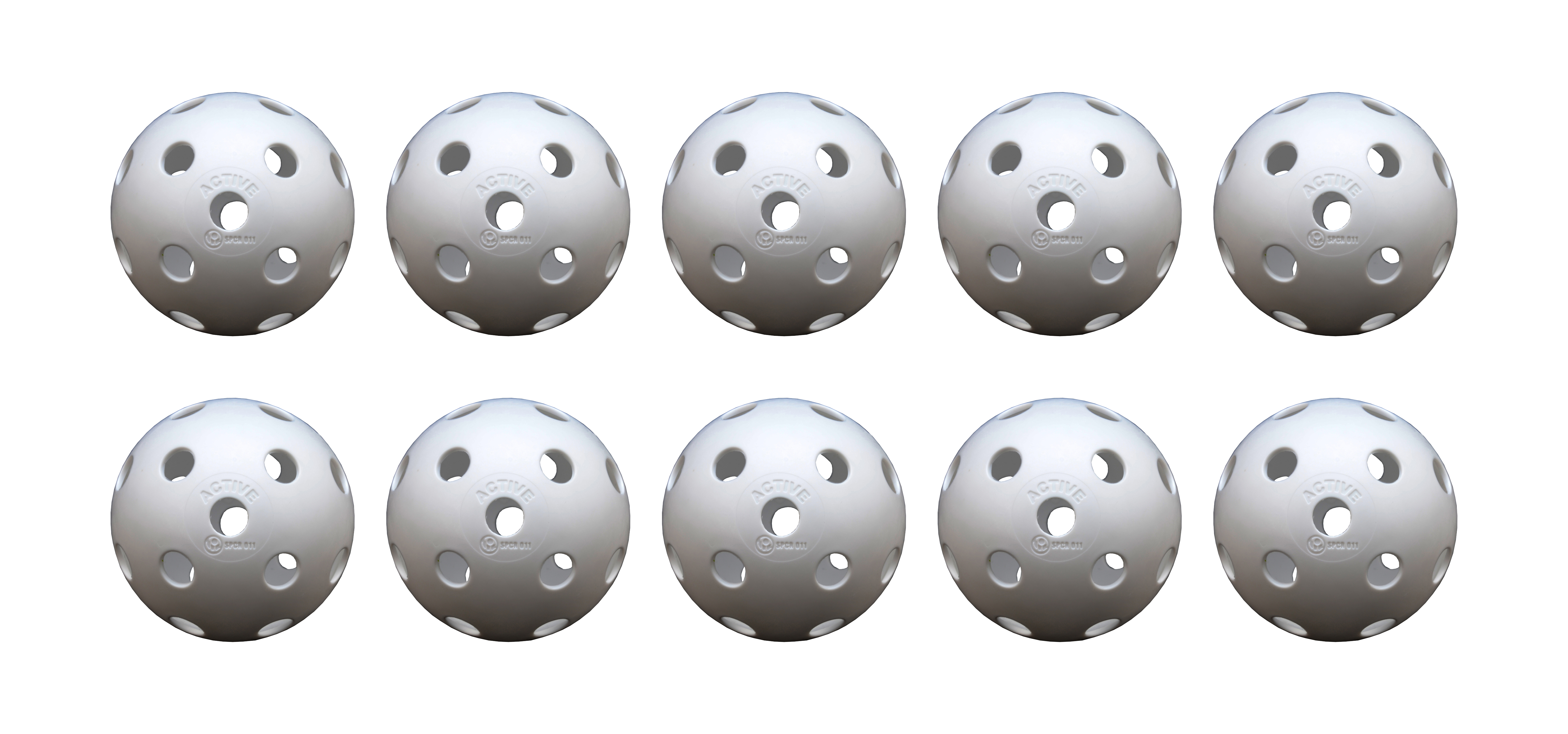 Förpackning med 10 vita innebandybollar som är IFF-certifierade och har en slät yta.