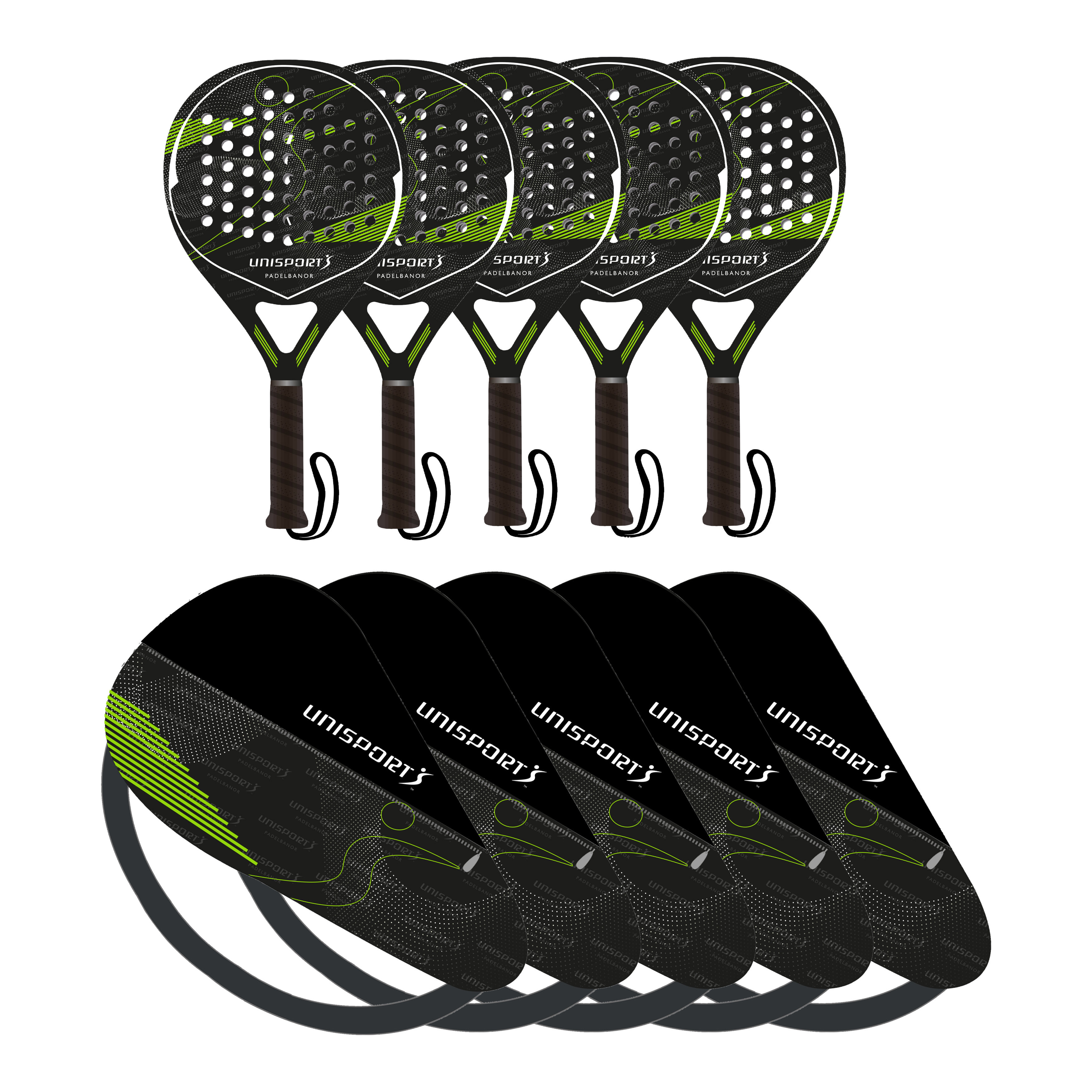 5-pack av Unisports premiumrack med allroundegenskaper. Padelracket är utmärkt för såväl duktiga amatörspelare till tävlingsspelare som söker extra fart. Racket har ett bekvämt grepp och är utrustat med ett handledsband för extra säkerhet. Inkl helfodral.